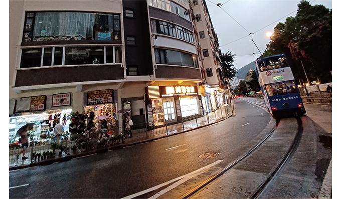 《明報月刊》創刊年的編輯部,在禮頓道一棟樓的二樓,圖中雜價攤(左側)樓上。作者攝於二○二三年三月。(丁望提供)