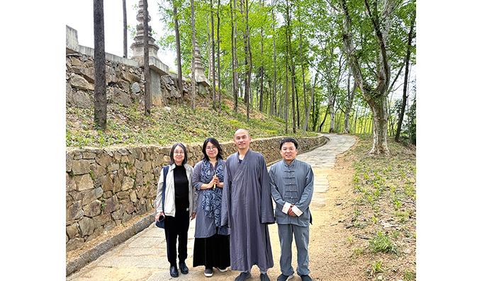 這石板路是六祖惠能走過的東山古道,左上方塔旁是公路,左起何蕙儀、王冰、崇玄法師、趙錠華。(鍾玲攝)