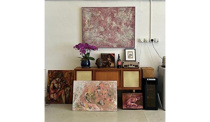 拜訪藝術家工作室,是了解藝術家與藝術品的難得機會。藝術品在畫廊被畫框和射燈裝扮得美侖美奐,藝術家也在媒體的打造下成為了明星,唯有在工作室之中,那才是最接近藝術家創作和藝術品誕生過程的真實的、混然一體的狀態。瑞貴的工作室總是播放音樂、點燃薰香,她說,繪畫就像寫視覺日記,用以反省和對抗那些影響她身心的熾熱的事物;在創作的過程中,有一種力量感、無限感及永恆感。我觀察到她在粗獷工廈中追求自己的精致,正如她在作品的恣意揮灑之中自有纖細遒勁。我率先被一幅粉紅色的抽象作品吸引,此作顏色柔美溫潤,卻同時飛舞晦澀的文字,似有萬語千言不吐不快,卻又欲說還休,像一把正在燃燒的夢囈般的火焰。瑞貴說:這是用一八四二年的日本能劇(Noh Theatre)劇本為媒材,加上油彩與土壤拼貼而成的作品,呈現她對日本傳統女性觀念的理解。